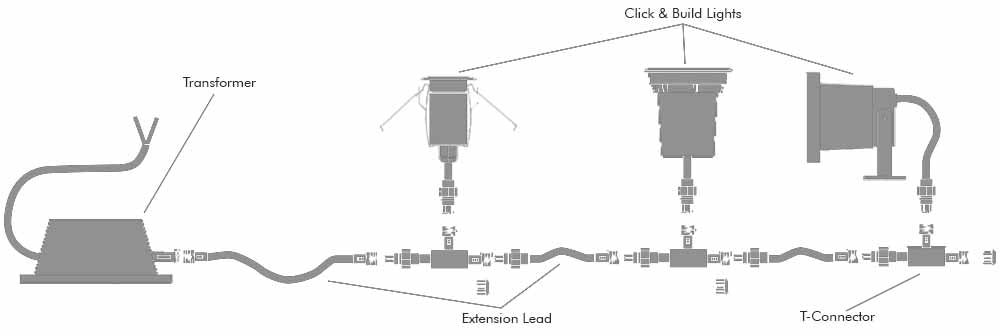 Our Click & Build range of products are fully interchangeable. Simply choose the lights you need along with the accessories to suit your project and build the perfect outdoor lighting scheme. All components use the same gauge of wiring and the same connectors.